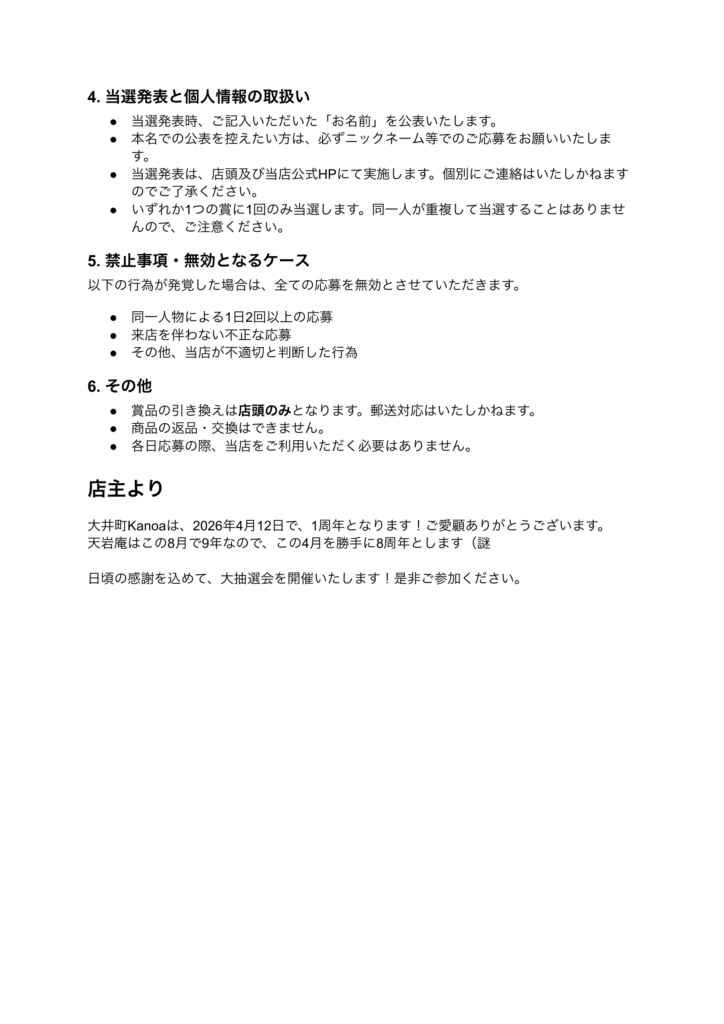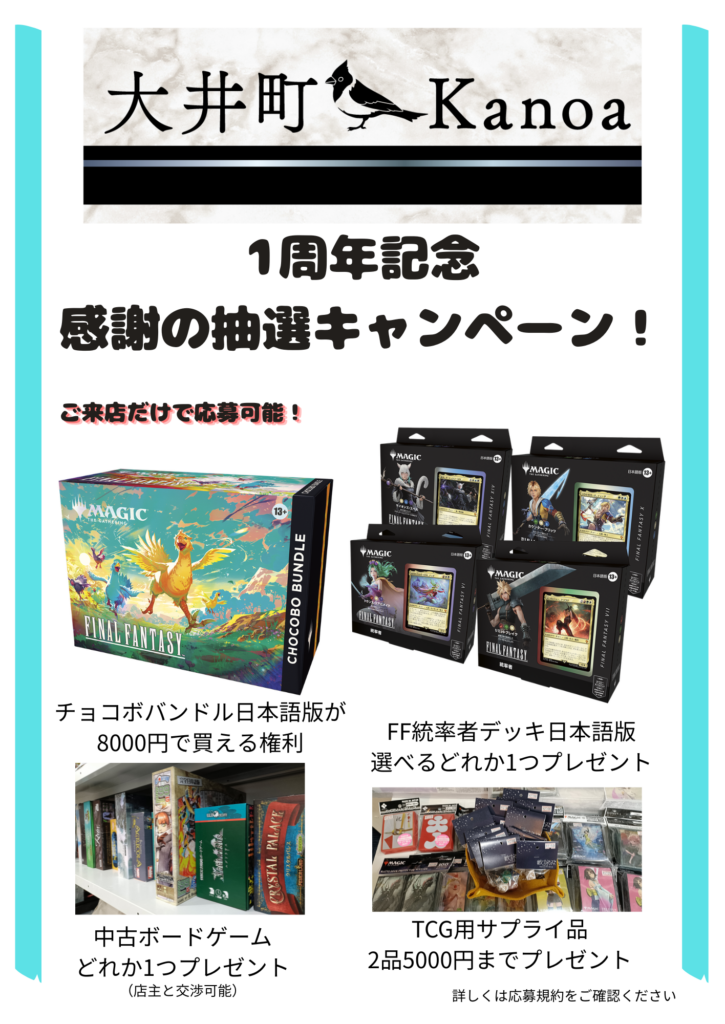 大井町Kanoa 1周年ありがとうございます:大抽選会のお知らせ