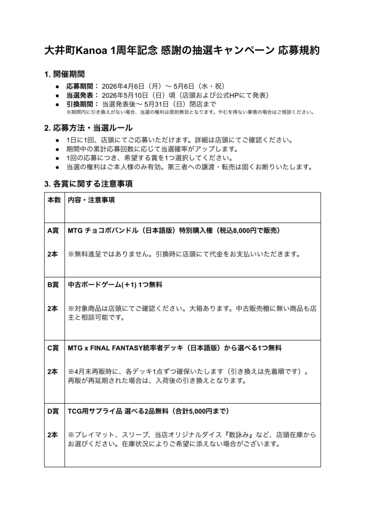 1周年を記念しまして、感謝の抽選キャンペーンを開催します!応募期間は4/6から約1ヶ月続きますので、ぜひご来店くださいませ。(詳しくは下記の応募規約をご確認ください)